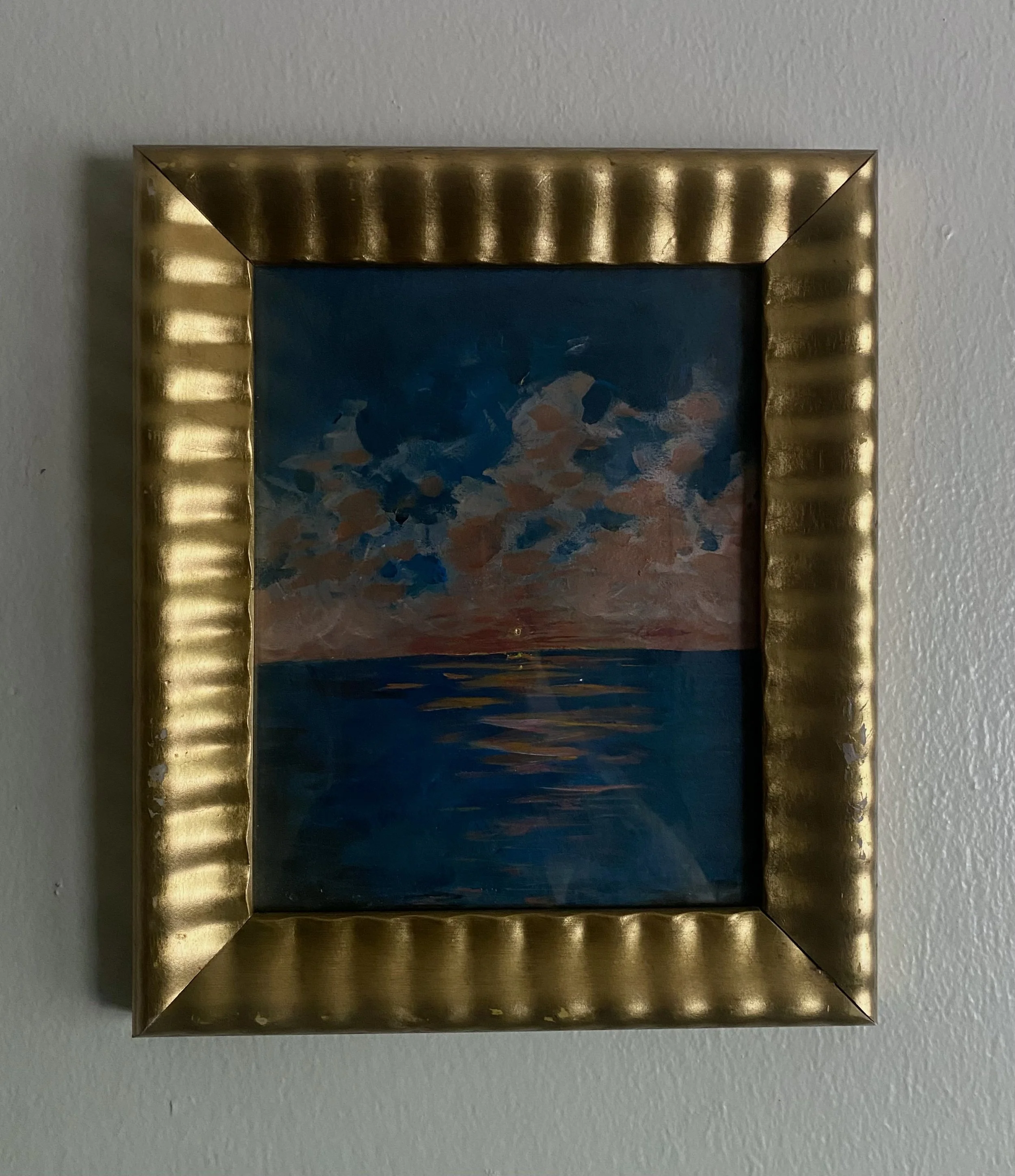 • Description: “A sunrise caught between warmth and water — deep blue meeting soft rose and gold. The frame carries a quiet, folk-like glow, echoing the calm strength of new light.”